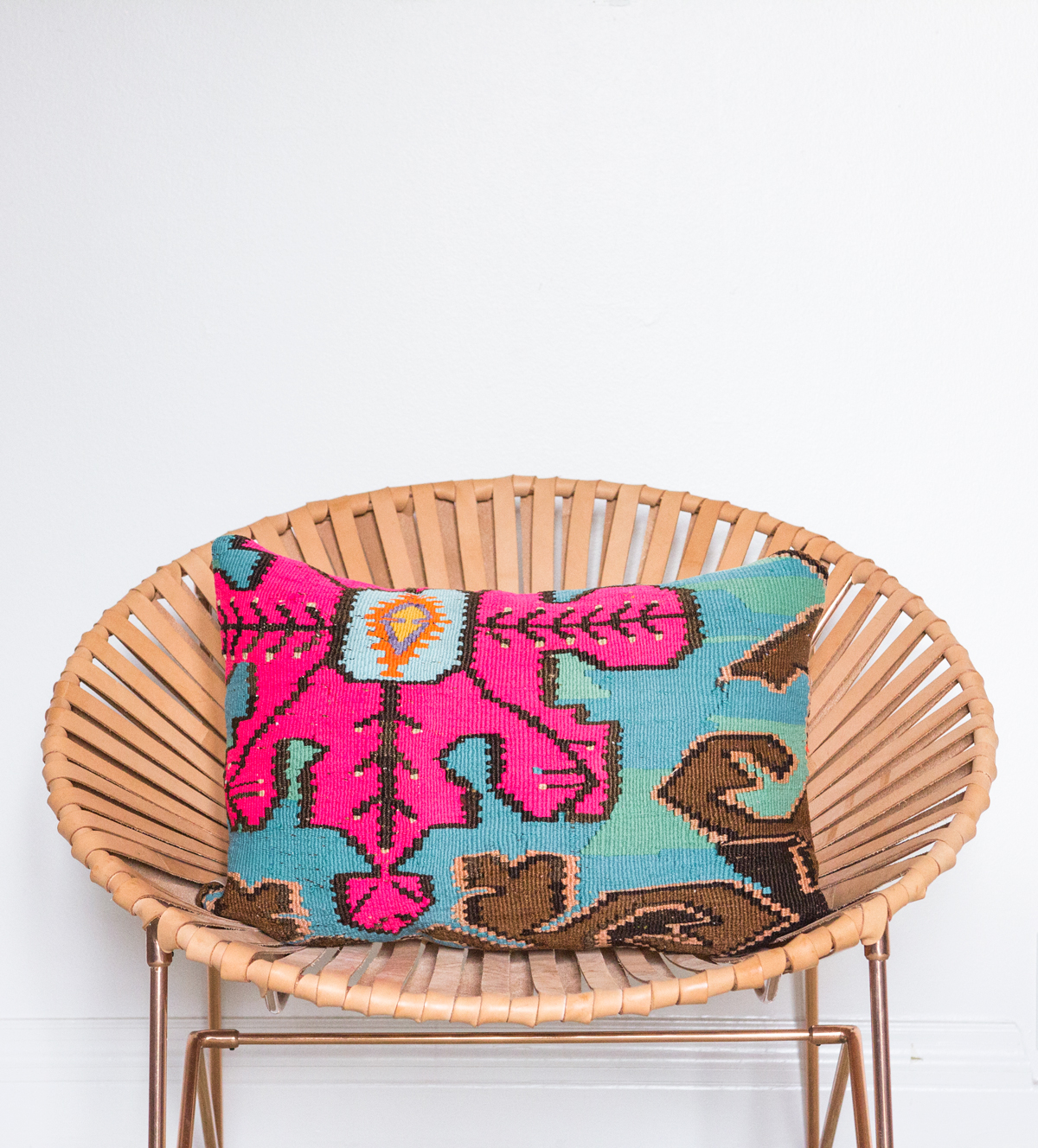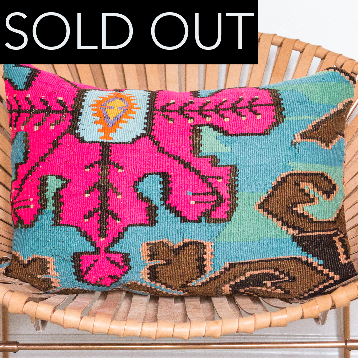 These rare pillows are made in Turkey from original vintage kilim rugs, hand-woven by Turkish artisans. Because of the artful nature of the kilim, many rugs are displayed as wall-hangings and show pieces. No two kilim pillows are the same, which makes each piece very special and unique.