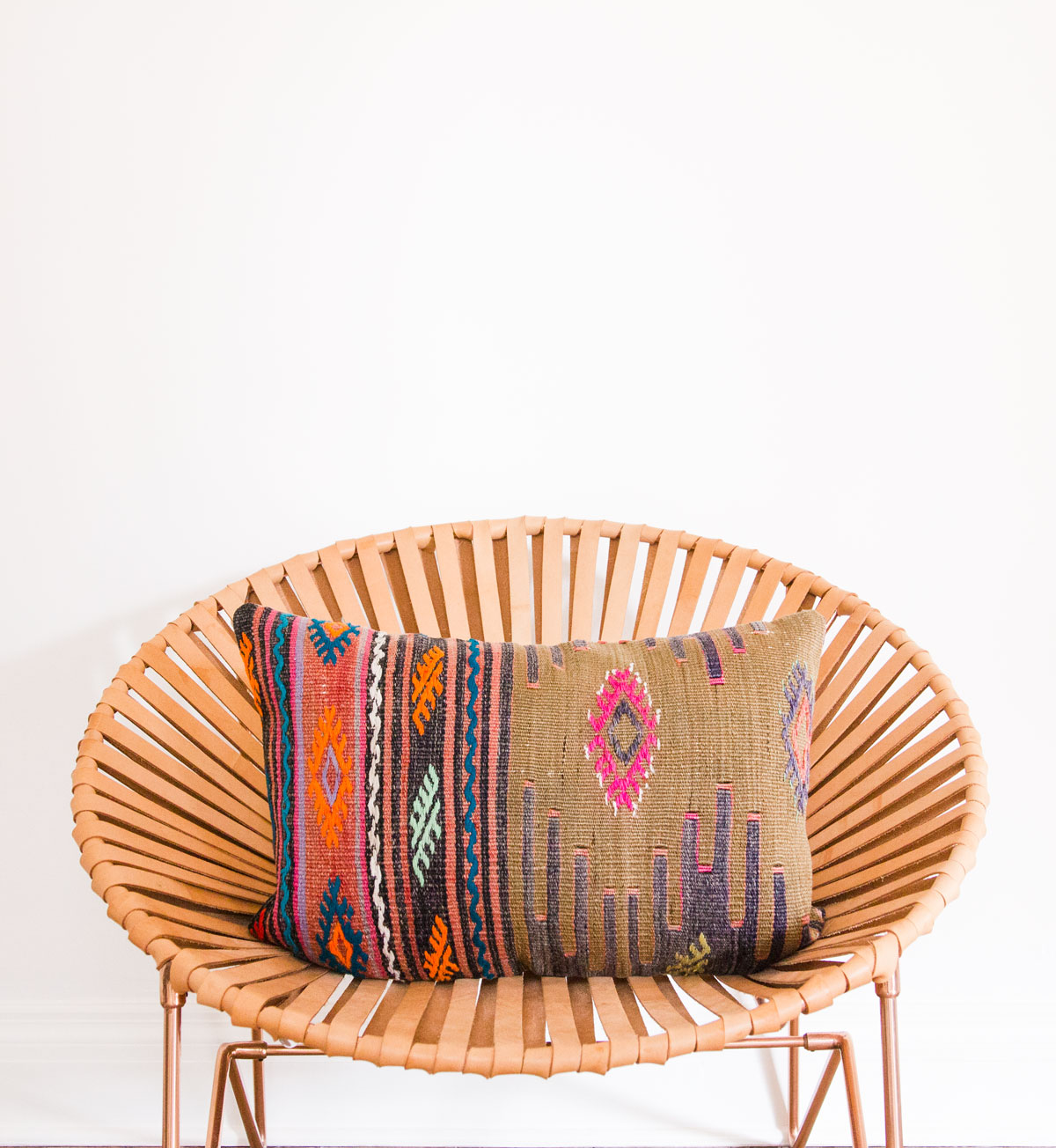 These rare pillows are made in Turkey from original vintage kilim rugs, hand-woven by Turkish artisans. Because of the artful nature of the kilim, many rugs are displayed as wall-hangings and show pieces. No two kilim pillows are the same, which makes each piece very special and unique.