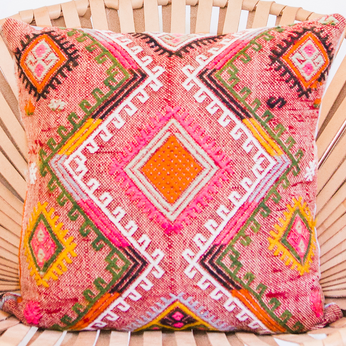 These rare pillows are made in Turkey from original vintage kilim rugs, hand-woven by Turkish artisans. Because of the artful nature of the kilim, many rugs are displayed as wall-hangings and show pieces. No two kilim pillows are the same, which makes each piece very special and unique.